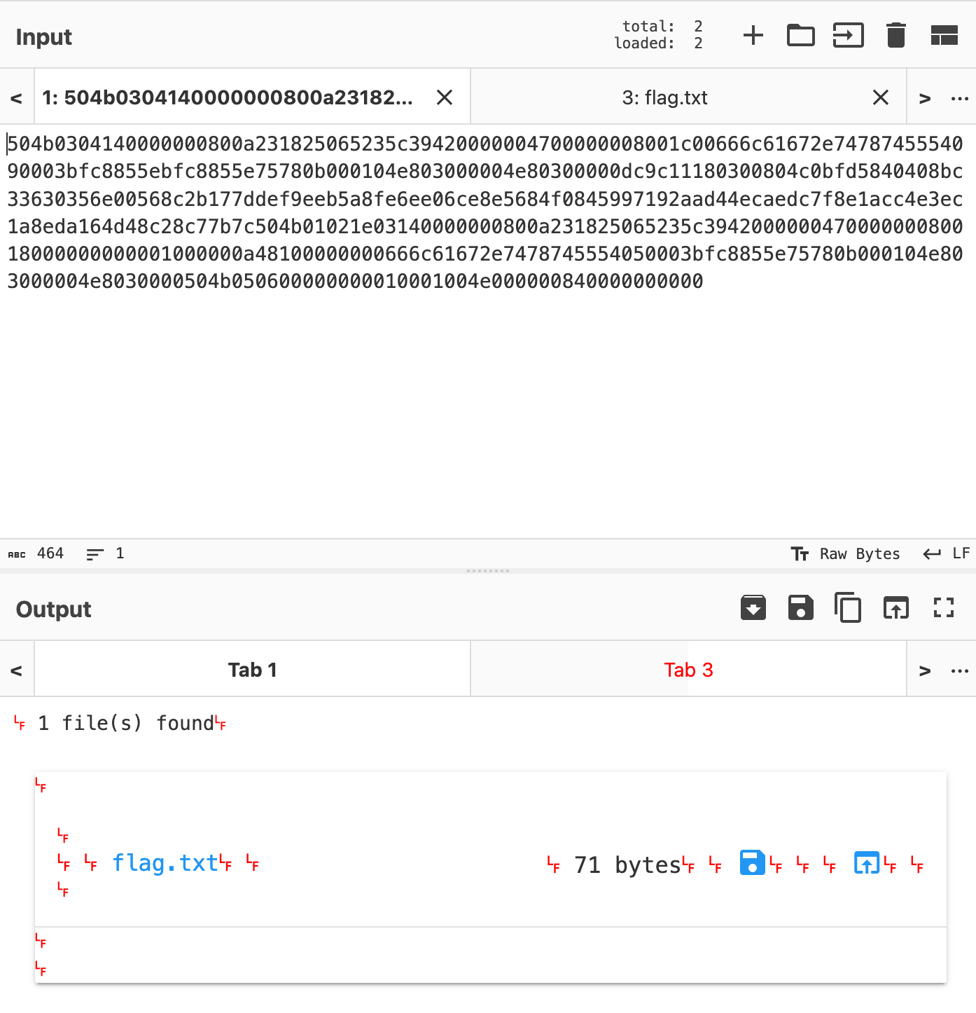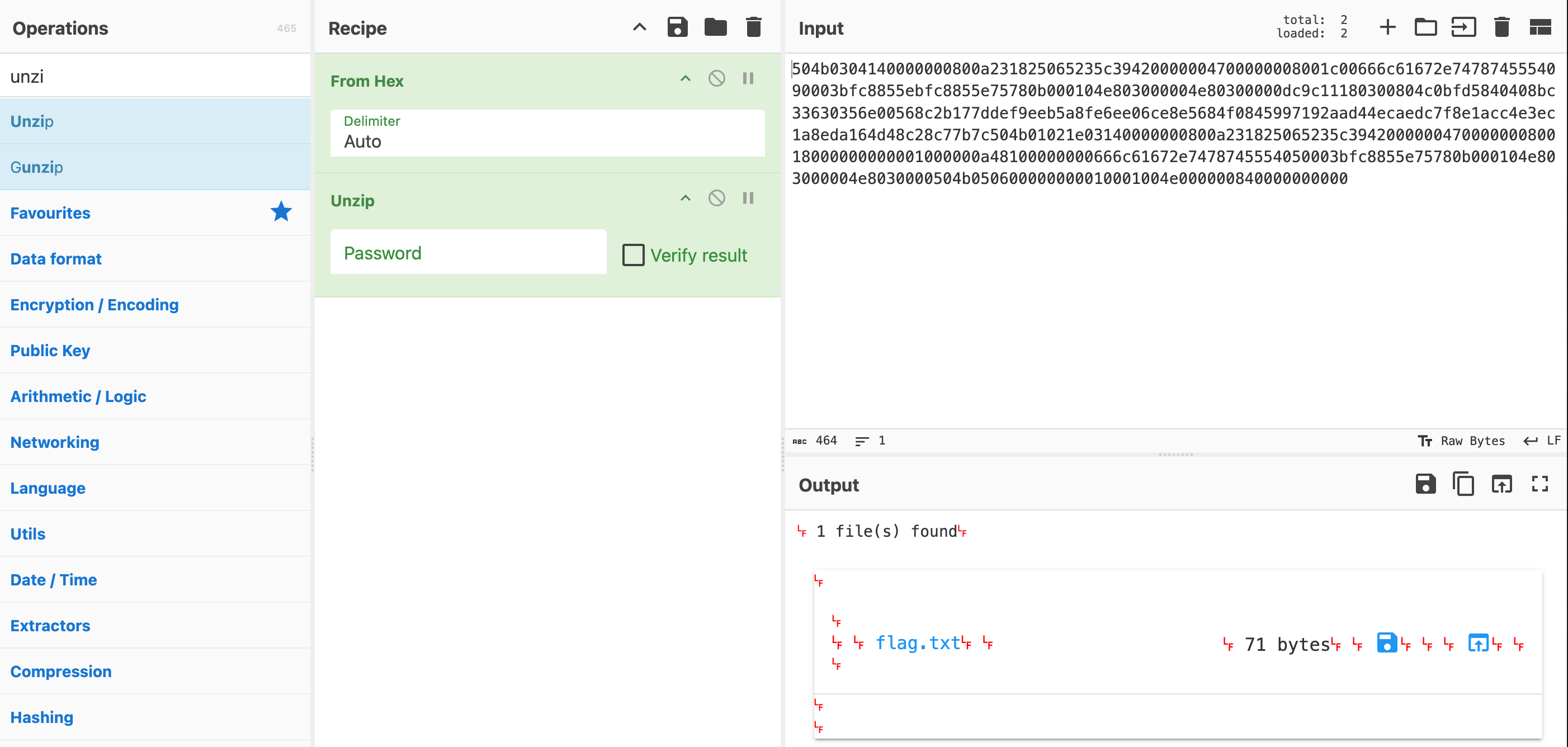 En module nous mettons From Hex avec un délimiteur Auto, puis un Unzip pour récupérer le fichier.