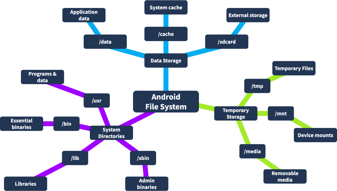 Android utilise un système de fichier basé sur Linux qui partitionne et met des “couches” pour gérer les données de manière sécurisée et efficace. La structure est personnalisée en fonction du matériel et de l’OS.
