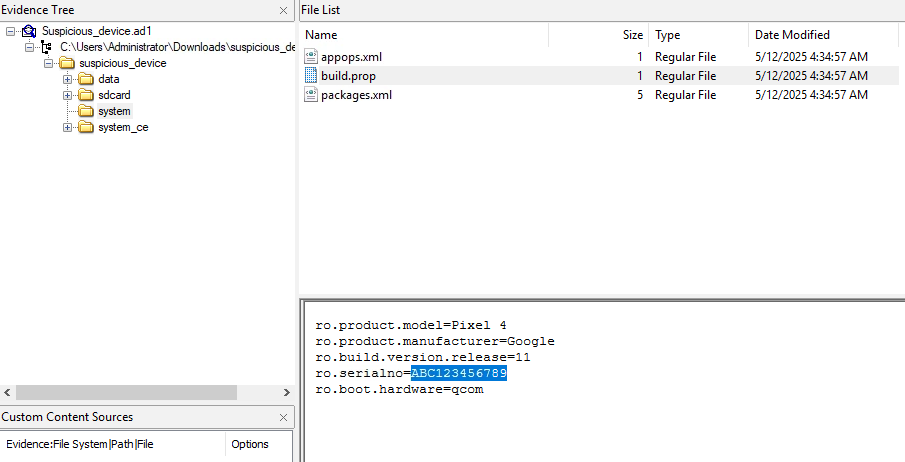 Le but de l’exercice ici est de trouver le numéro de série qui se trouve dans /system/build.prop: