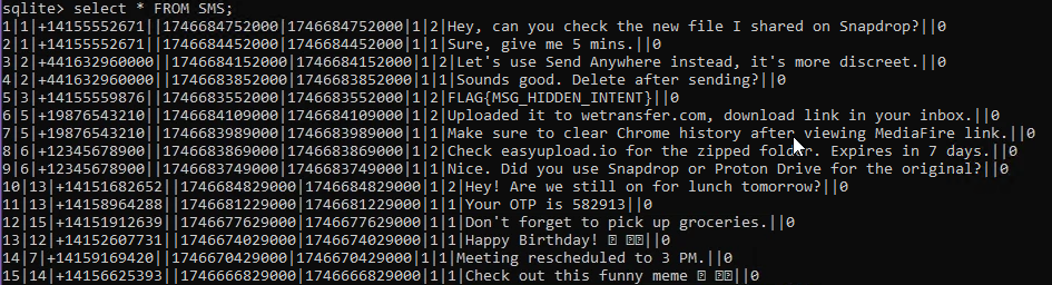 On envoie une requête SQL pour nous afficher TOUT les messages de la base sms :