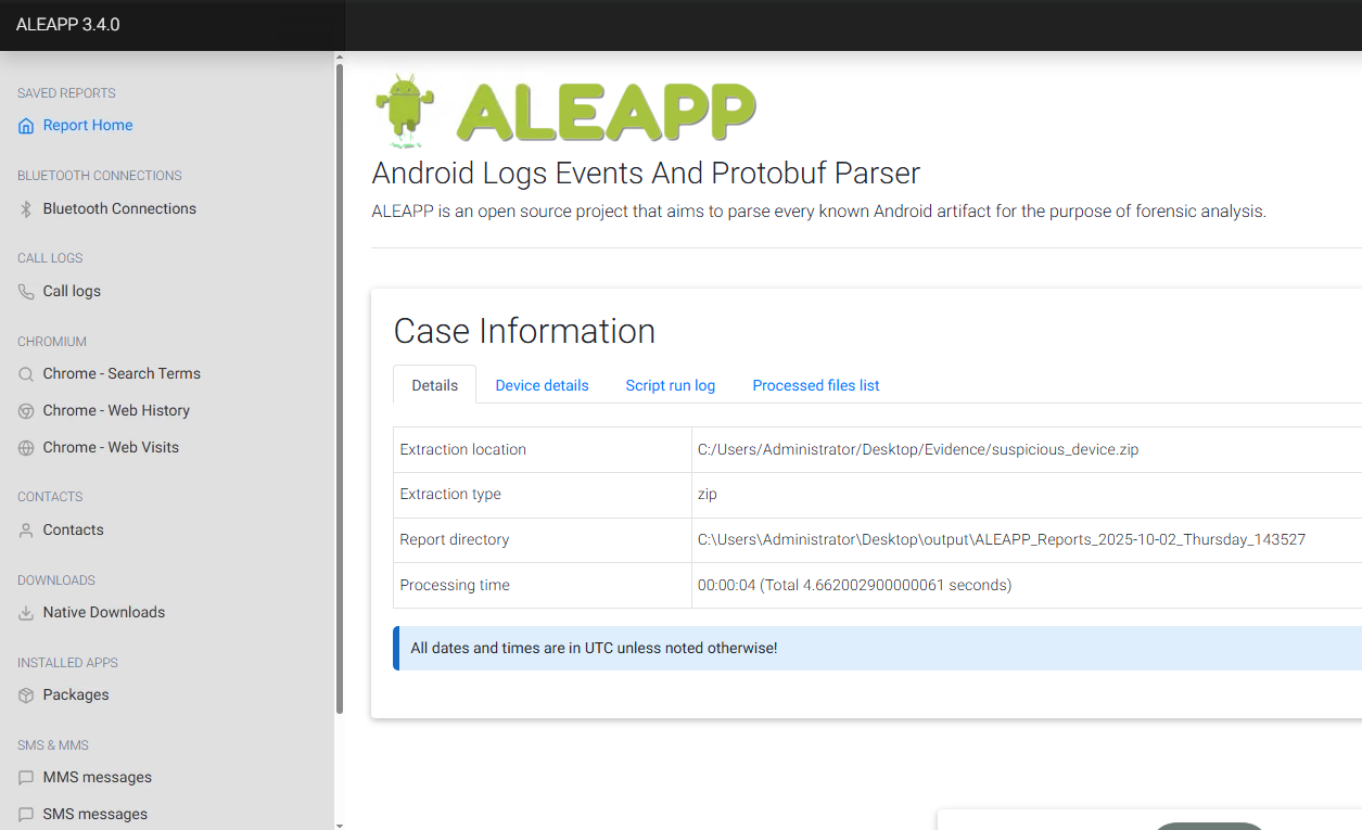 aLEAPP analyse et fournit un rapport lisible par nous. Il possède 2 interface, une graphique et l’autre en ligne de commande.